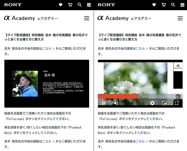 「【ライブ配信講座】特別講座 並木 隆の写真講座 春の花がぐっと良くなる撮り方と整え方【アーカイブ配信中】」は3月にTeamsでオンライン配信されたαアカデミーのセミナーで、それを収録したアーカイブ動画が7月3日まで配信されていて、6月30日までに申し込みをすると特別に無料で受講できる、という内容になっています。