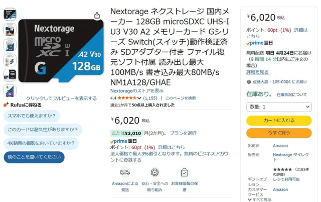 なお、本日時点でAmazonでのNextorageのmicroSDカードの販売状況をみると128GBのみ販売されています。※Amazon側でも販売ページは確認できますが、価格や在庫は変動しやすいため、購入時は最新表示をご確認ください。