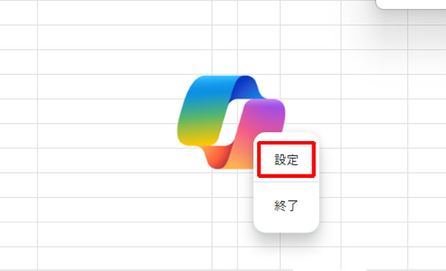 すると、画面にご覧のCopilotアイコンが登場します。これを右クリックして「設定」を呼び出します。