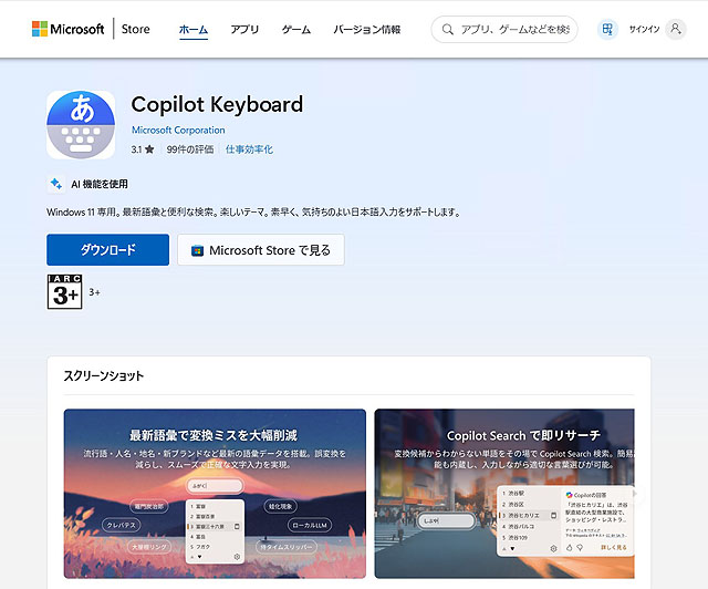 使い方は簡単。「Copilot Keyboard」で検索してアプリをインストールするだけです。Microsoft Storeで検索すると見つかります。