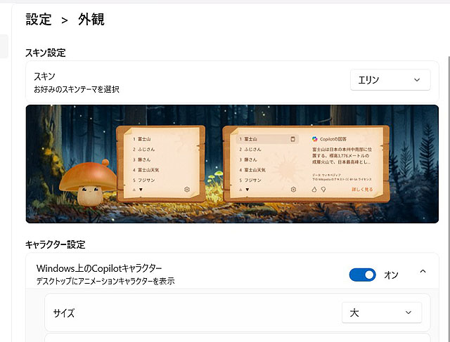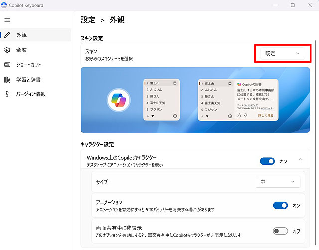これがCopilot Keyboardの設定画面です。スキンというのがあるので、ここで4つのキャラクターから好きなキャラクターに変換すると。。。