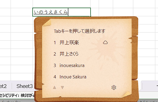 なるほど、さっきまでIMEで「いのうえさくら」と入力しても芸能人の「井上咲楽」さんの名前は出てこなかったのに、変換候補の一番上にきますね。ATOKみたいです。