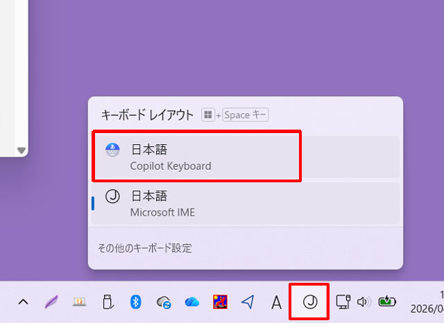 インストールが終わったらタスクバーの右下にある「J」のマークをクリックしてキーボードレイアウトを日本語(Copilot Keyboard)に切り替えます。