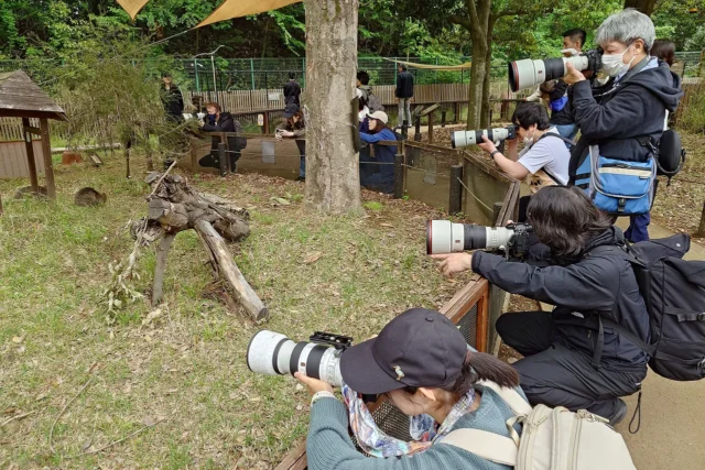 口角の上がってるクオッカを下からあおるようにして撮ると、見本みたいな笑顔が撮れるんですが、柵があるので、これがなかなか難しいんです。クオッカが上を向いた瞬間とかがチャンス。できるだけ低い位置からクオッカを狙うのでみんなしゃがんで撮影をします。