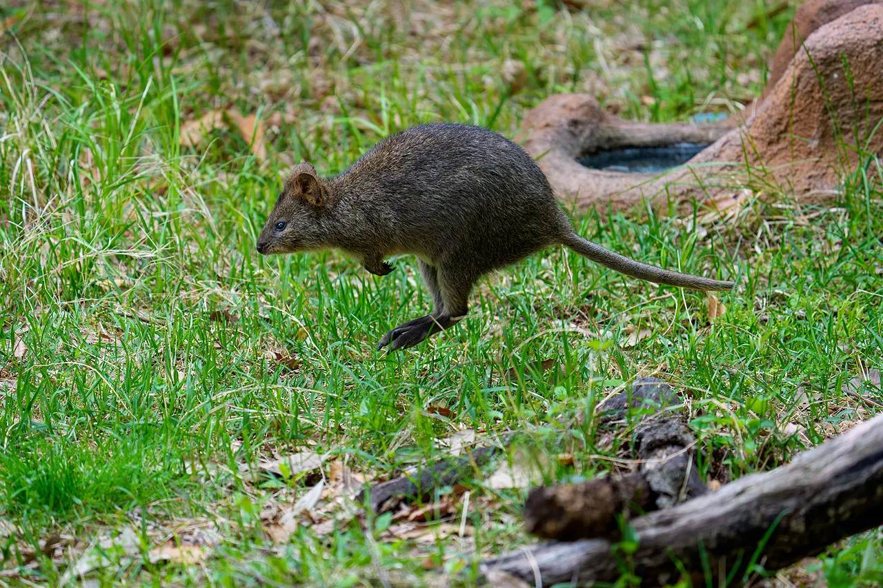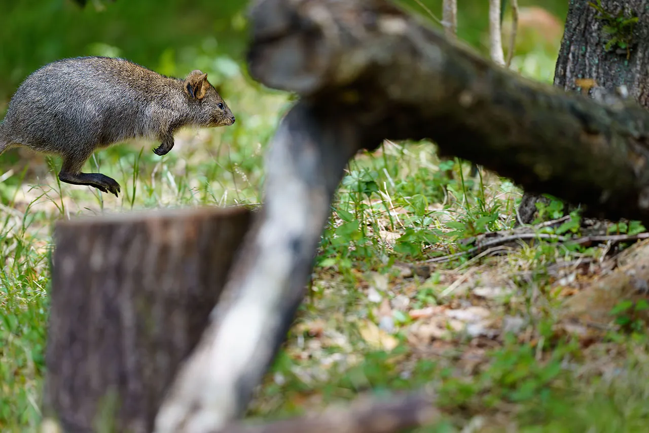 これはいい瞬間をしっかり仕留めていますね。地面から少し浮いた“跳び出しの一瞬”を横位置で切り取っているので、クオッカの動きとリズムがそのまま伝わってきます。