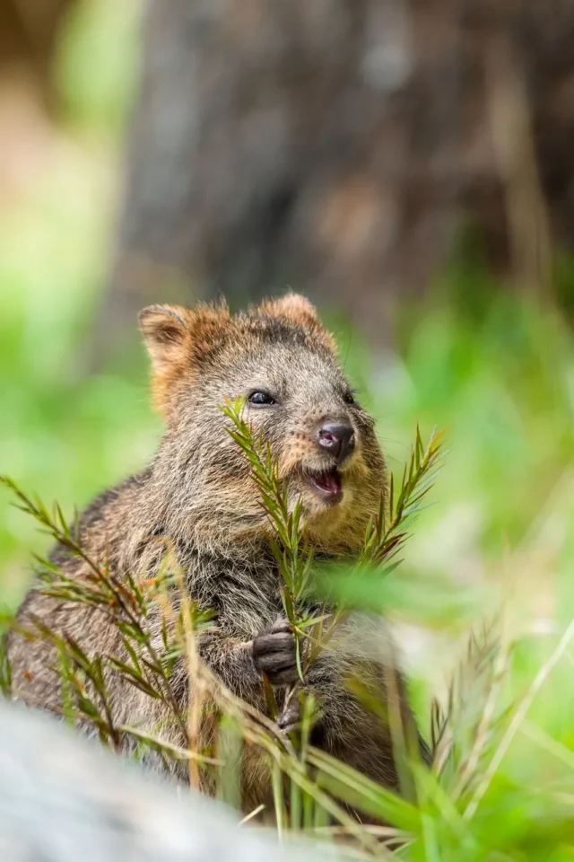 少し口を開けたタイミングを逃さず捉えているので、クオッカの生き生きとした魅力がそのまま伝わってきます。前ボケの草がうまく効いていて奥行きもあり、背景の柔らかいボケと相まって主役がしっかり浮き上がっています。