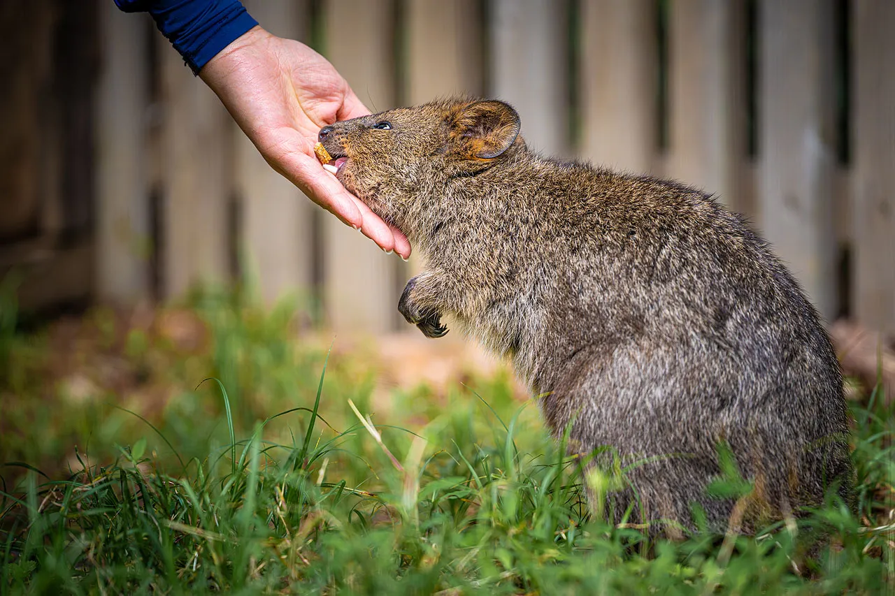 飼育員さんの手とクオッカの距離感をテーマにした、とてもストーリー性のある一枚ですね。