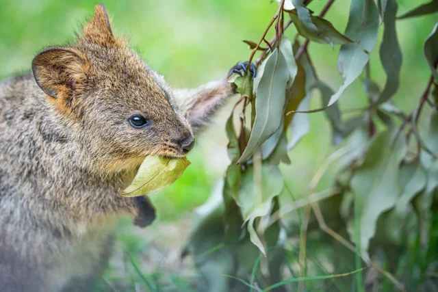 葉をくわえながら前足で枝を引き寄せる仕草がとても愛らしく、「森のひとくち」というタイトルがぴったりと重なる一枚ですね。どこか見覚えのある響きで、思わずニヤッとしてしまいました。クオッカの生活のワンシーンを切り取ったような自然さがあり、見ている側もその場の空気を感じられます。