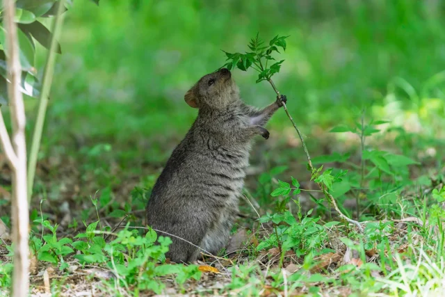 背筋を伸ばして枝を引き寄せる仕草がとても印象的で、クオッカの“動き”をしっかり作品にしている一枚ですね。低いポジションから狙っていることで背景がきれいに抜け、主役のシルエットがすっと浮かび上がって見えるのがとても気持ちいいです。