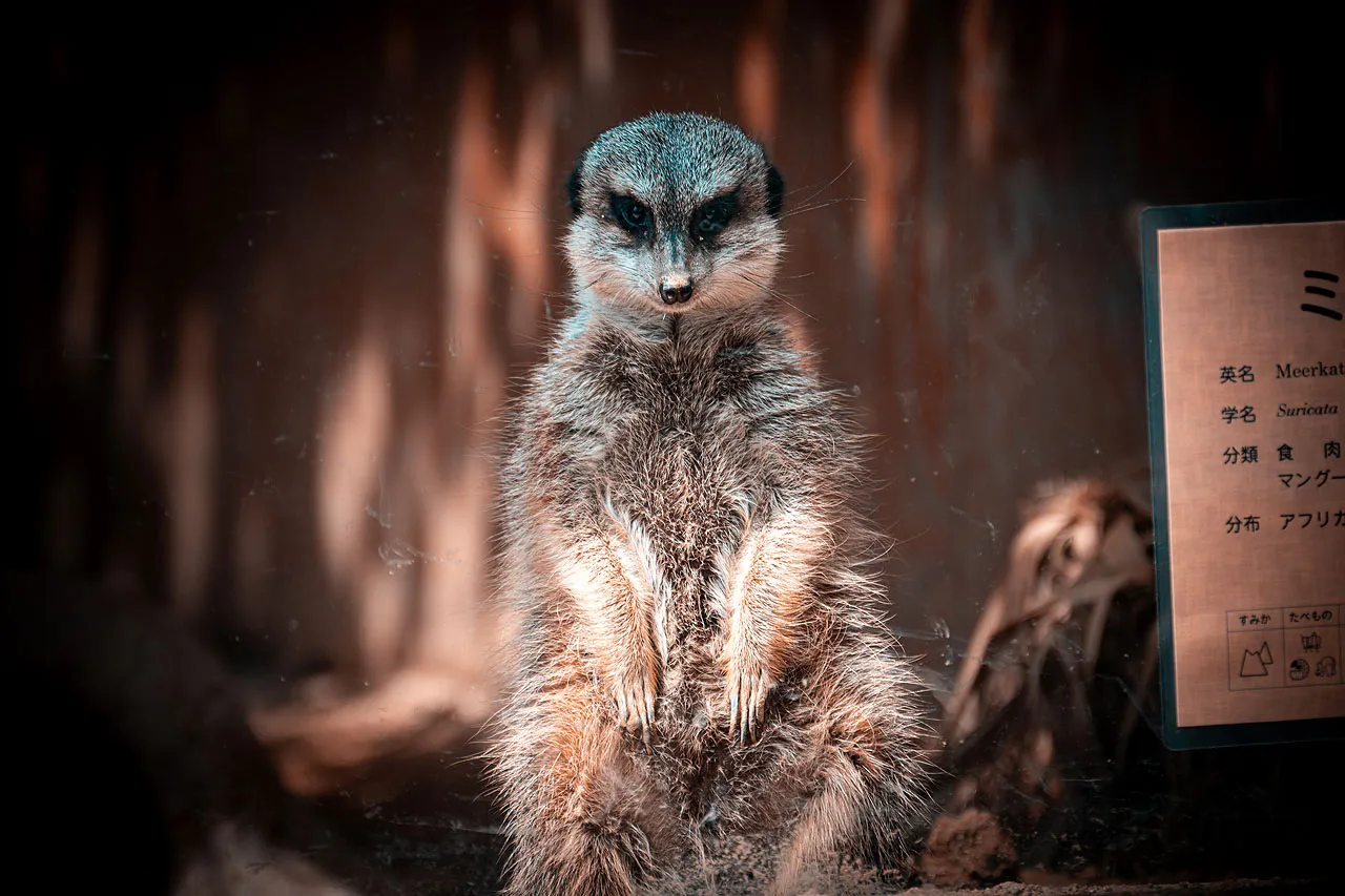 この作品は一気に空気が変わりますね。ミーアキャットの直立した姿を真正面から捉えた構図に、ややローキー寄りのトーンとコントラストが効いていて、タイトル通り「見られている」緊張感がしっかり伝わってきます。