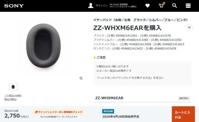 WH-1000XM6のイヤーパッドがソニーストアで単品購入できるようになりました。