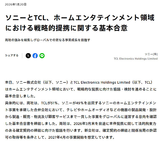 ☆ソニー 報道資料「ソニーとTCL、ホームエンタテインメント領域における戦略的提携に関する基本合意」