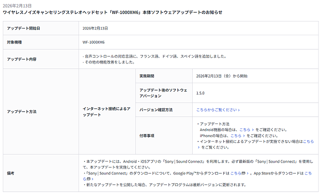 先行予約が始まったばかりで発売前の「WF-1000XM6」ですが、初のアップデート「Ver.1.5.0」が公開になっています。アップデート内容は以下の通りです。