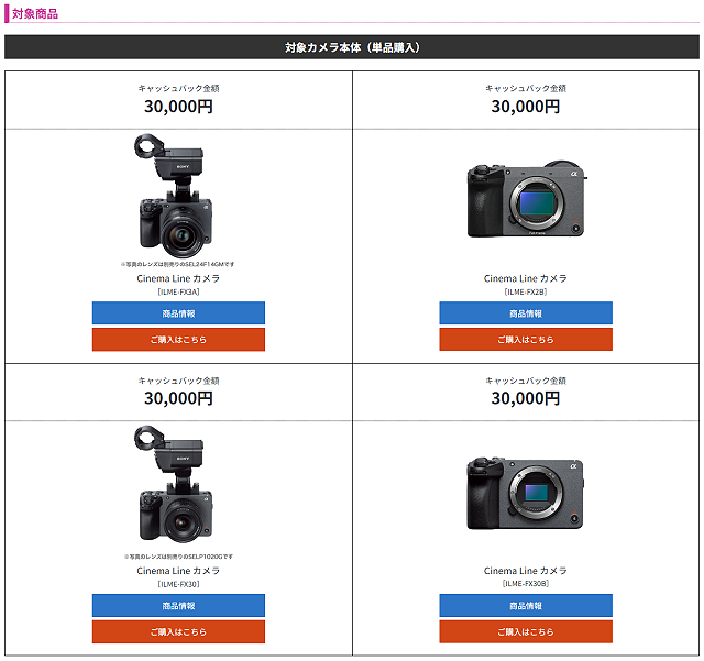 このキャンペーンではCinema Line カメラ「FX3」、「FX2」、「FX30」いずれかを購入し、応募することで3万円のキャッシュバックが受けられます。