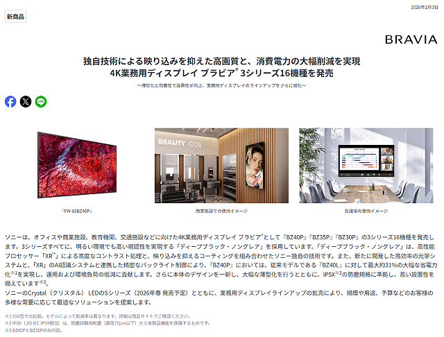 ソニーのニュースリリースにて「独自技術による映り込みを抑えた高画質と、消費電力の大幅削減を実現 4K業務用ディスプレイ ブラビア® 3シリーズ16機種を発売」と発表がありました。