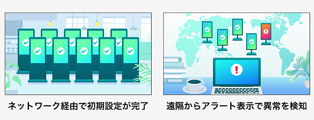 あらかじめクラウド上で設定を行い、設置時にスマートフォンと連携するだけで、ネットワーク経由でディスプレイを立ち上げられます。