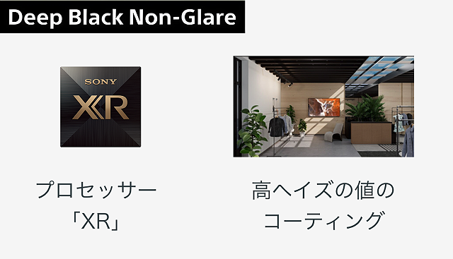 「ディープブラック・ノングレア」は、認知特性プロセッサー「XR」による高度なコントラスト処理と、高いヘイズ値のコーティングを組み合わせることにより、映り込みを抑えながら、コントラストの高い高画質を実現するソニー独自の技術です。