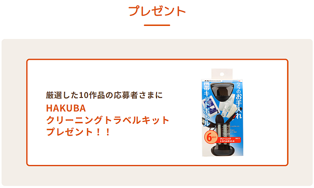 また、応募作品の中から厳選された10名には「HAKUBA クリーニングトラベルキット」がプレゼントされます。カメラやレンズのメンテナンスに役立つアイテムで、持ち運びにも便利なクリーニングキットとなっています。