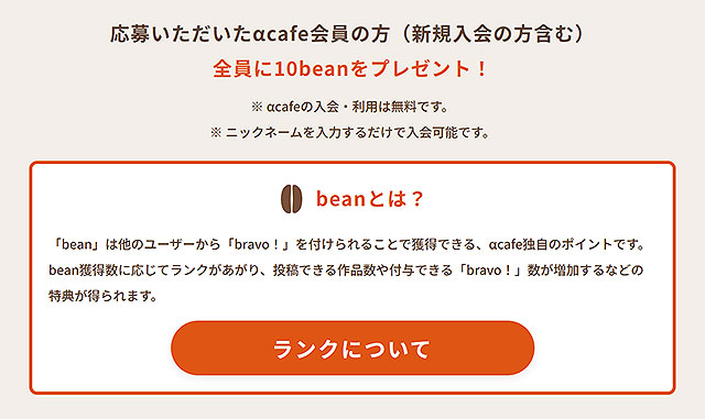「bean」とはαcafe内で使われるポイントで、他のユーザーから作品に「bravo!」が付けられることで獲得できる仕組みです。beanを集めることでユーザーランクが上がり、投稿できる作品数が増えたり、「bravo!」を付けられる数が増えるなどの特典が用意されています。なお、αcafeは無料で入会でき、ニックネームを登録するだけで簡単に利用を開始できます。