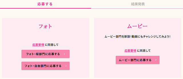 応募部門は写真と動画の2つ。フォト部門では「桜部門」と「自由部門」が用意されており、春らしい桜の作品はもちろん、チューリップやネモフィラ、菜の花など季節の花々をテーマにした作品も応募できます。