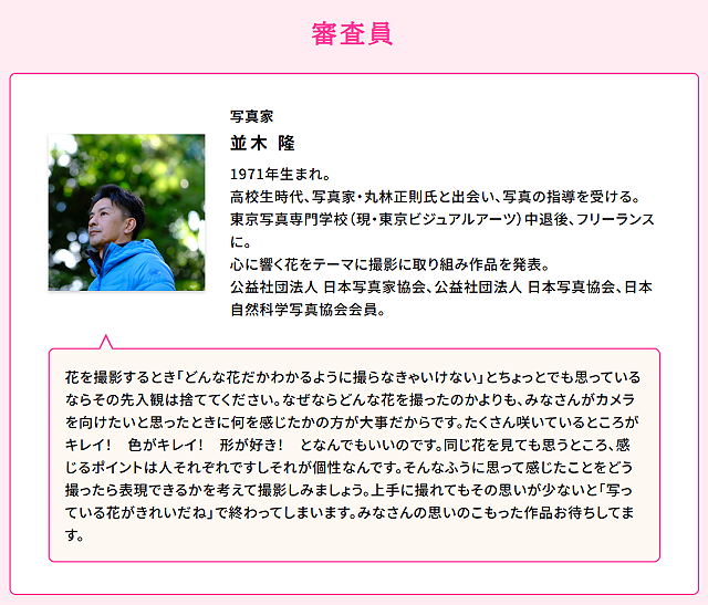審査員には、花写真で知られる写真家・並木隆氏が参加。さらに旅行ガイド「まっぷる」の編集長もゲスト審査員として加わり、作品の魅力を多角的に評価してくれます。作品の完成度だけでなく、「何を感じて撮影したのか」という表現力も重視されるコンテストとなっているのがポイントです。