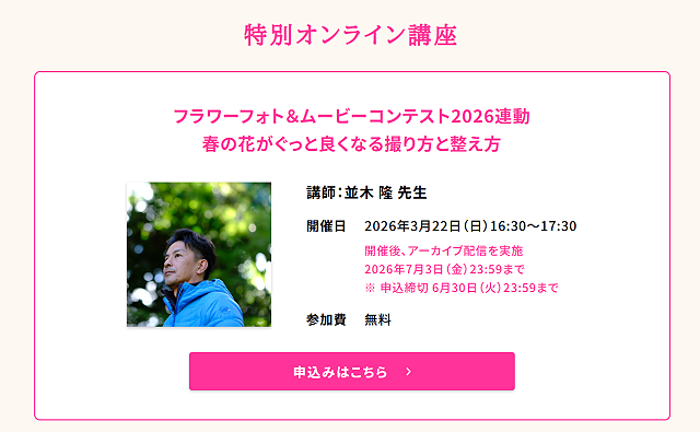 さらに今回のコンテストでは、花撮影のコツを学べる無料のオンライン講座も用意されています。プロのテクニックを学びながら作品づくりに挑戦できるため、これから写真を始めたい方やステップアップしたい方にもおすすめです。