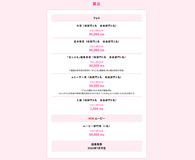 気になる賞品ですが、各部門の大賞にはソニーポイント5万円分が用意されているほか、審査員賞や編集長賞、αユーザー賞など複数の賞が設定されています。入選作品にもポイントが進呈されるため、チャレンジしがいのある内容になっています。詳細は以下の通りです。