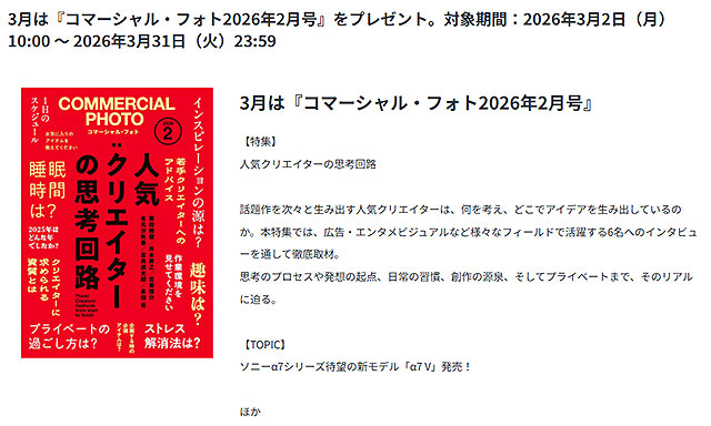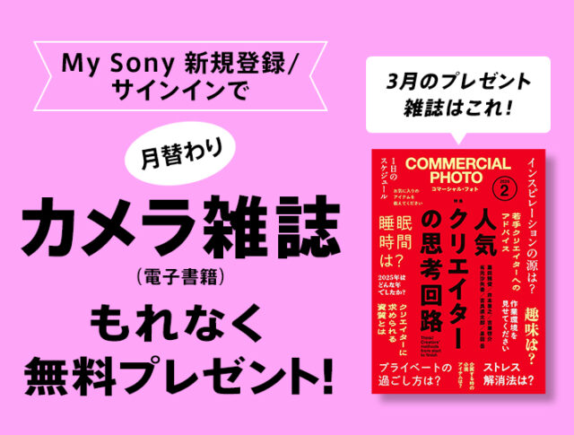 3月は『コマーシャル・フォト2026年2月号』になります。My Sony IDをすでにお持ちの方だけではなく新規ID登録された方も対象です。