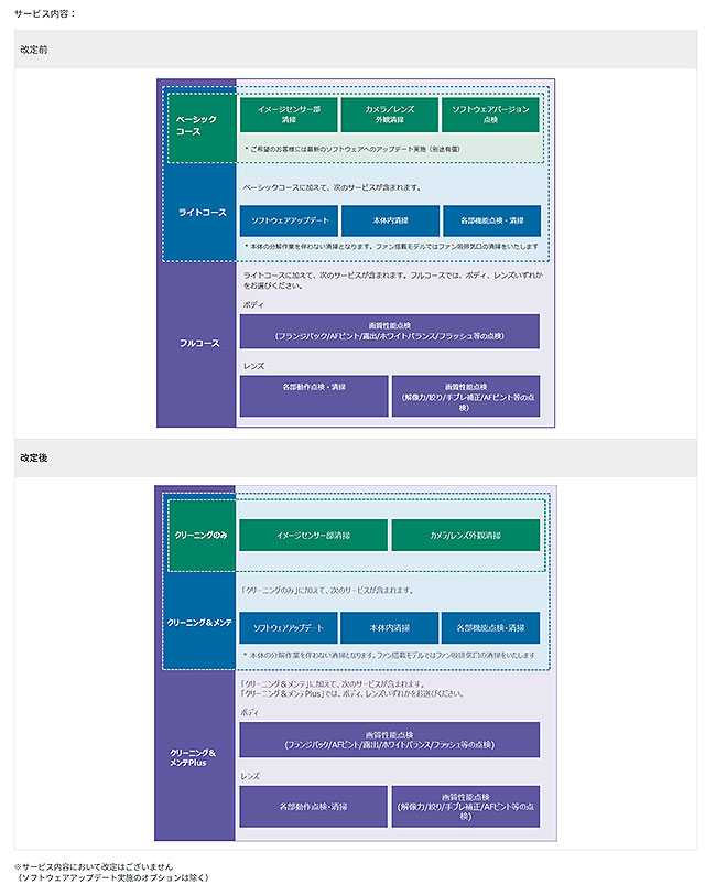 また、「クリーニングのみ」は構成変更により、これまでより実質的に価格は上がっています。とはいえ、サービス内容が「ボディ1台+レンズ1本」から「ボディ1台+レンズ2本まで」変更されているので、多くの方にとってはメリットのある内容になっています。