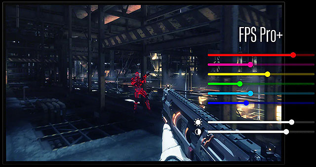 FPS Pro+モードは、有機ELの優れた輝度と色再現性、コントラストによる高い敵の視認性の中で、さらに敵の輪郭に使用される色(赤、黄、紫)を強調するように画質調整を行い、もっとも敵が見やすいように開発された画質モードです。FPSで数多く登場するエフェクトの中でも極めて敵が見やすく、バトルにおいて優位な状況を生み出します。