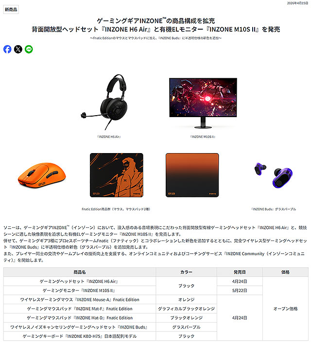 ソニーより、ゲーミングギアINZONEの新製品として、背面開放型有線ゲーミングヘッドセット『INZONE H6 Air』と、競技シーンに適した映像表現を追求した有機ELゲーミングモニター『INZONE M10S II』が発表になりました。