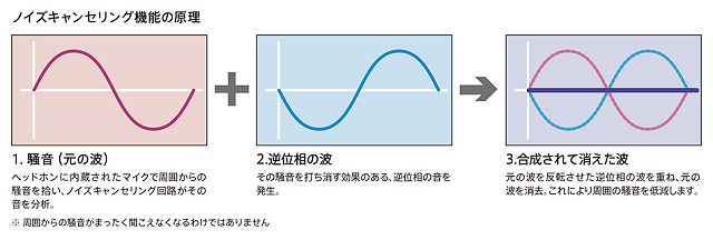ノイズキャンセリングはヘッドホンに内蔵されたマイクで周囲からの騒音を拾い、ノイズキャンセリング回路がその音を分析。その騒音をうち消す効果のある、逆位相の音を発生させ、もとの音の波を打ち消すことで騒音を低減する仕組みです。