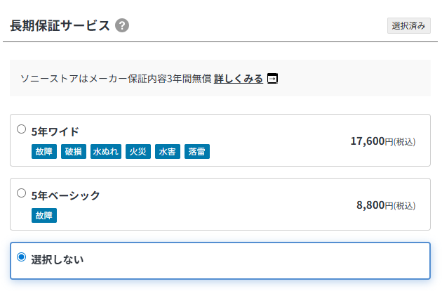 | 長期保証 | 5年ワイド:17,600円 5年ベーシック:8,800円 3年ベーシック:無償 |