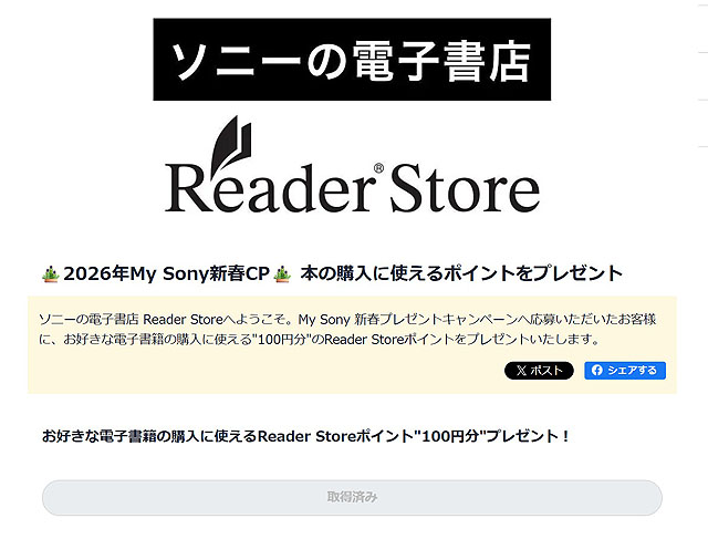 キャンペーン応募すると全員にReader Storeの100円クーポンがその場でもらえます。すぐにクーポン取得することができて、2月末までの利用期限で電子書籍の購入に利用ができます。Reader Storeのアカウントがある方は速攻で登録してしまいましょう。