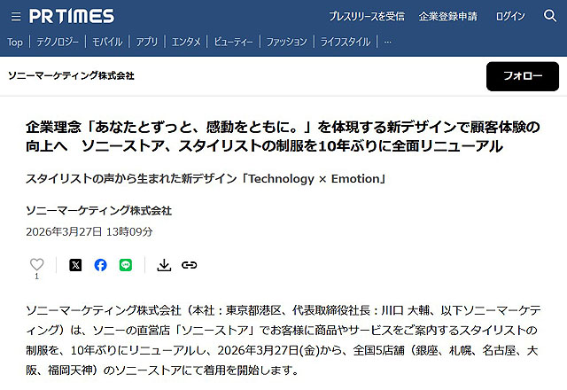 ☆PR TIMES『企業理念「あなたとずっと、感動をともに。」を体現する新デザインで顧客体験の向上へ ソニーストア、スタイリストの制服を10年ぶりに全面リニューアル』