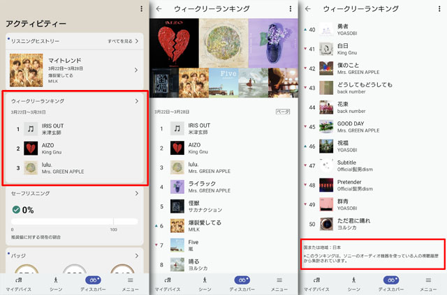 「このランキングは、ソニーのオーディオ機器を使っている人の視聴履歴から集計されています」とのことです。