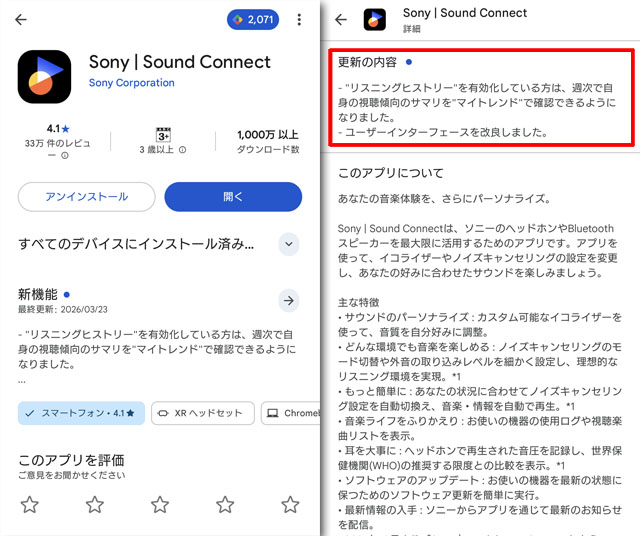 ソニーのヘッドホンアプリ「Sound Connect」に新しい表示機能が追加されています。