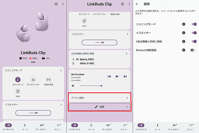 細かいところですがホーム画面のUIも一部変更になっています。上記はバージョン 12.5.1のホーム画面になります。「デバイス編集」というのは一覧でヘッドホンの設定を行う画面で、今まではホーム画面の最下部に位置していたのですが、これが一番上に移動してアクセスしやすくなっています。